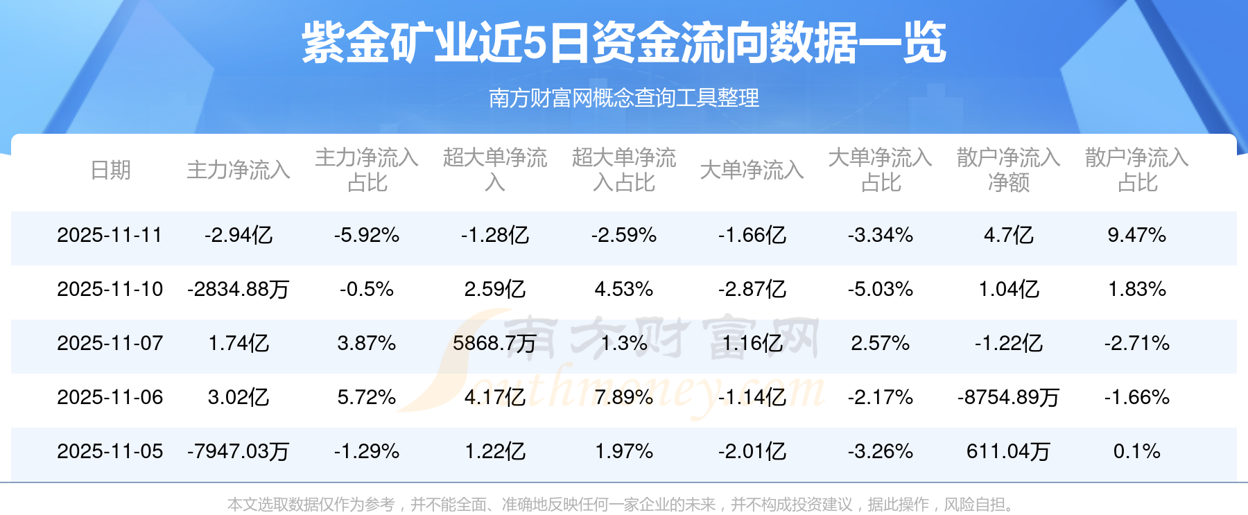 11月11日消息,紫金礦業(yè)主力資金凈流出2.94億元,超大單資金凈流出1.28億元,散戶資金凈流入4.7億元。