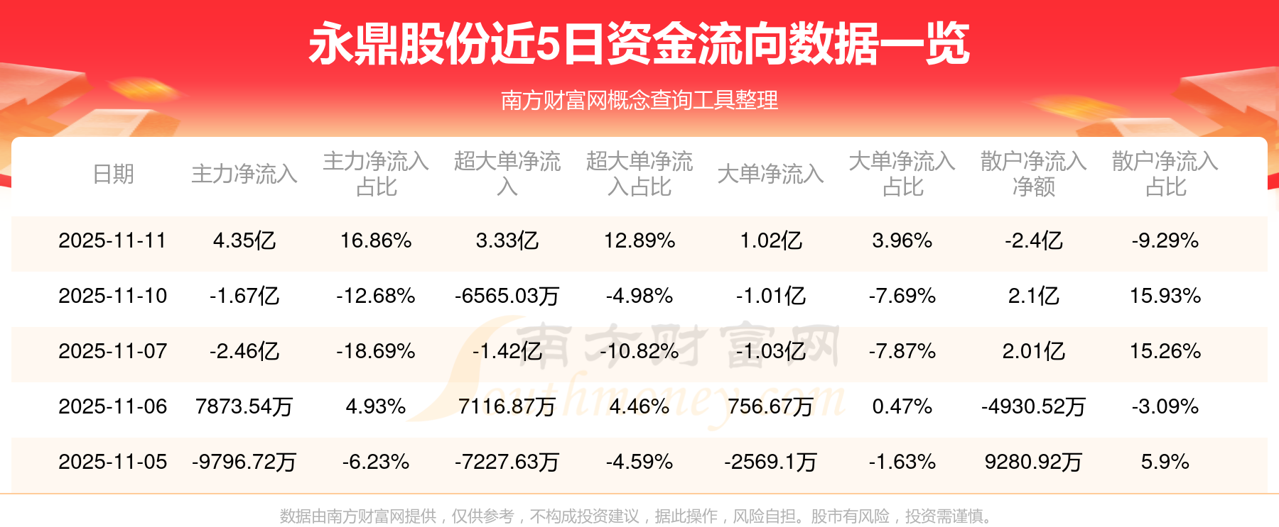 11月11日該股主力凈流入4.35億元,超大單凈流入3.33億元,大單凈流入1.02億元,中單凈流出1.95億元,散戶凈流出2.4億元。