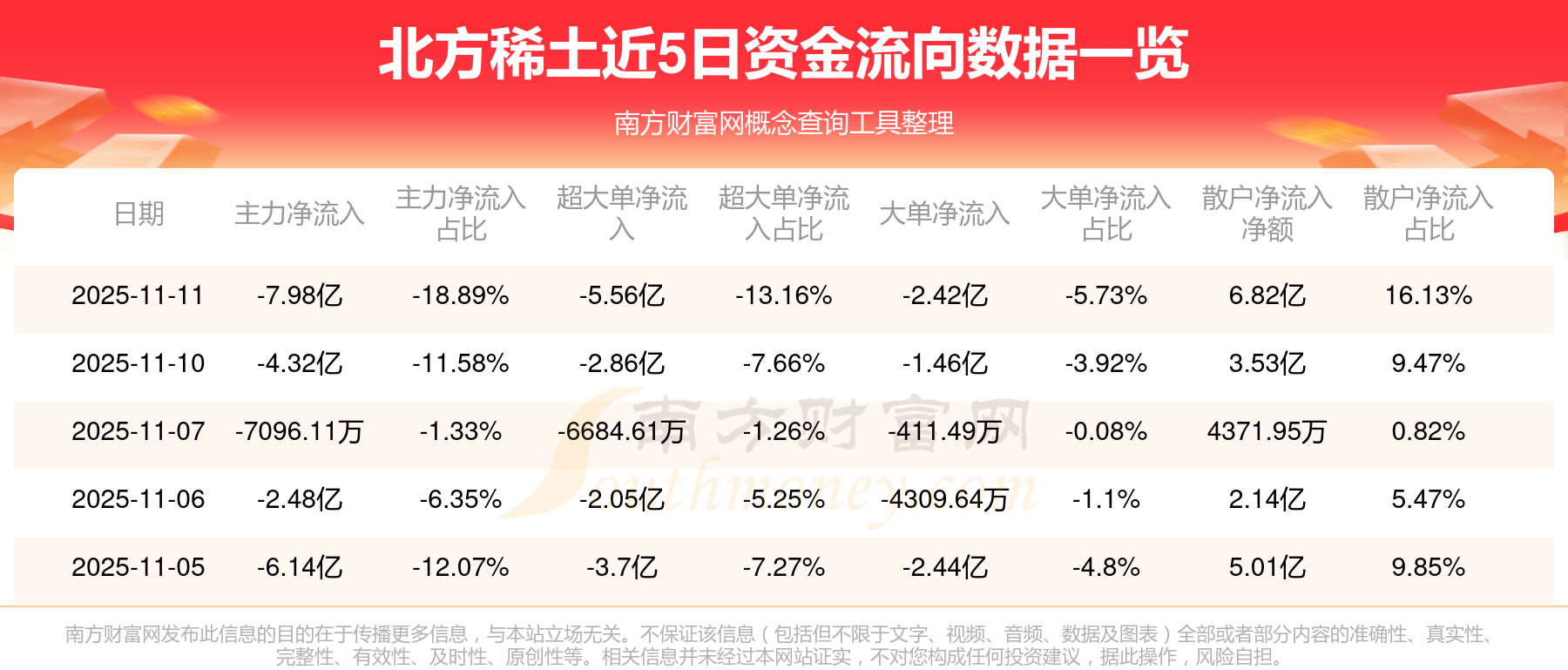 11月11日消息,北方稀土主力資金凈流出7.98億元,超大單資金凈流出5.56億元,散戶資金凈流入6.82億元。