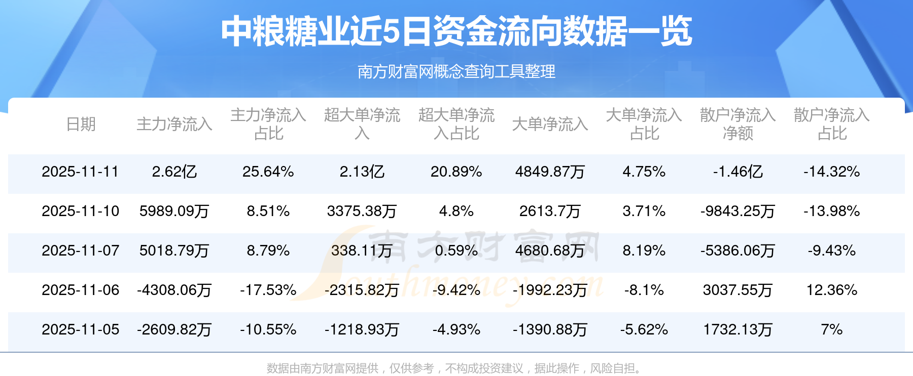 11月11日該股主力凈流入2.62億元,超大單凈流入2.13億元,大單凈流入4849.87萬元,中單凈流出1.16億元,散戶凈流出1.46億元。