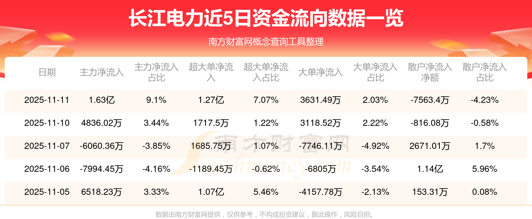 11月11日該股主力資金凈流入1.63億元,超大單資金凈流入1.27億元,大單資金凈流入3631.49萬元,中單資金凈流出8718.74萬元,散戶資金凈流出7563.4萬元。