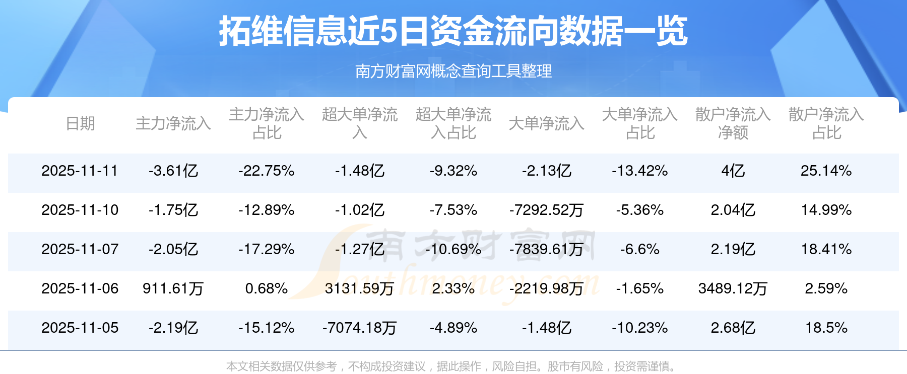 11月11日消息,拓維信息11月11日主力凈流出3.61億元,超大單凈流出1.48億元,大單凈流出2.13億元,散戶凈流入4億元。