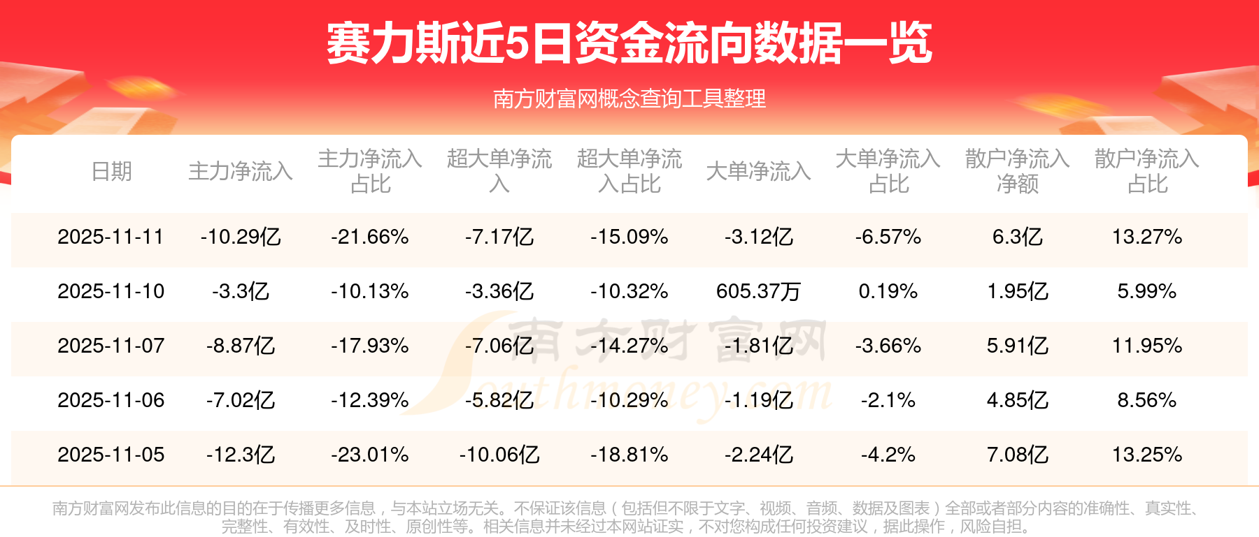 11月11日消息,賽力斯主力凈流出10.29億元,超大單凈流出7.17億元,散戶凈流入6.3億元。