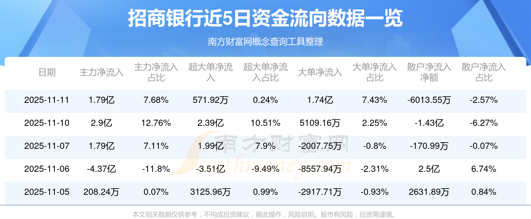 11月11日消息,招商銀行主力凈流入1.79億元,超大單凈流入571.92萬元,散戶凈流出6013.55萬元。