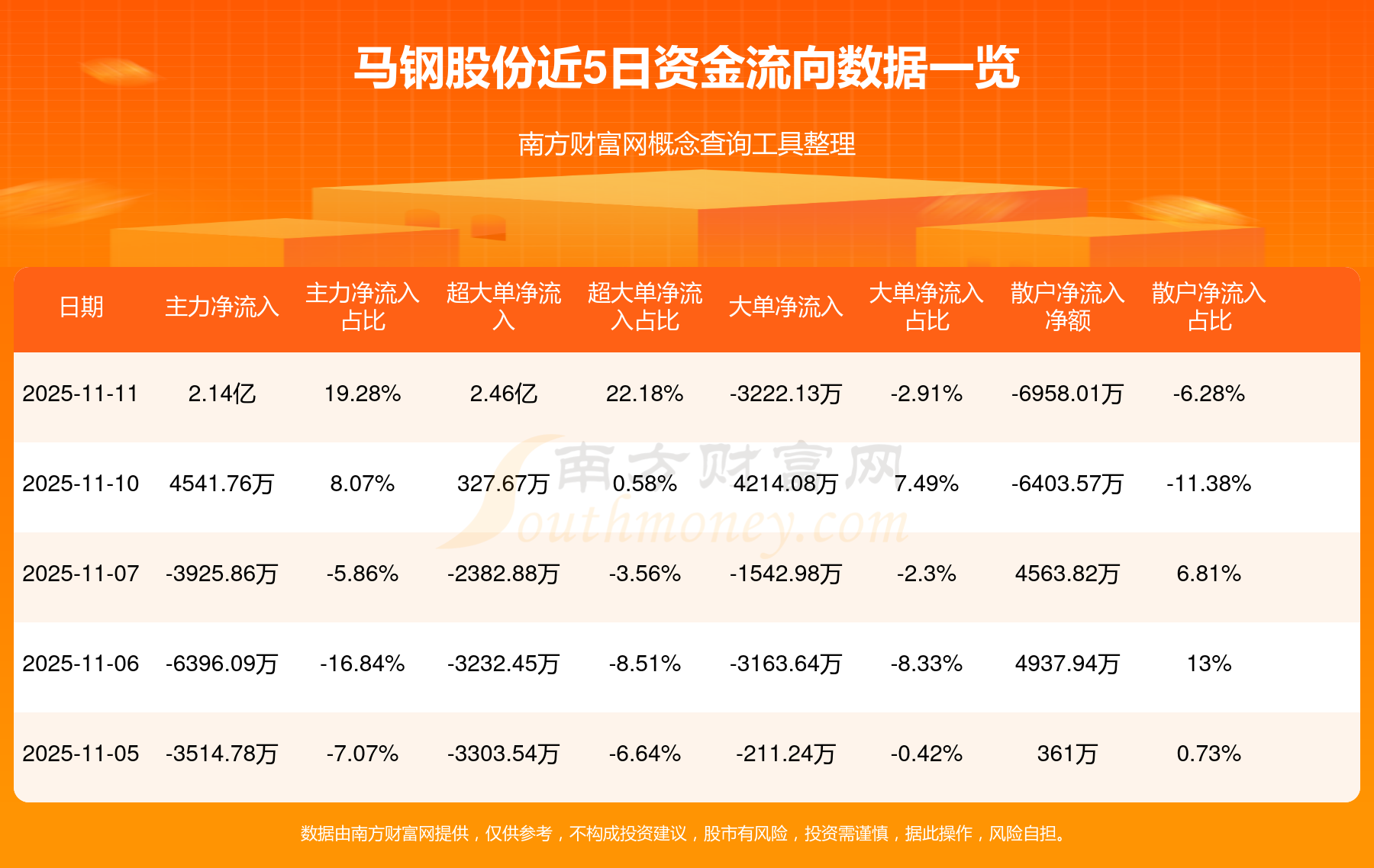 11月11日消息,馬鋼股份主力資金凈流入2.14億元,超大單資金凈流入2.46億元,散戶資金凈流出6958.01萬元。
