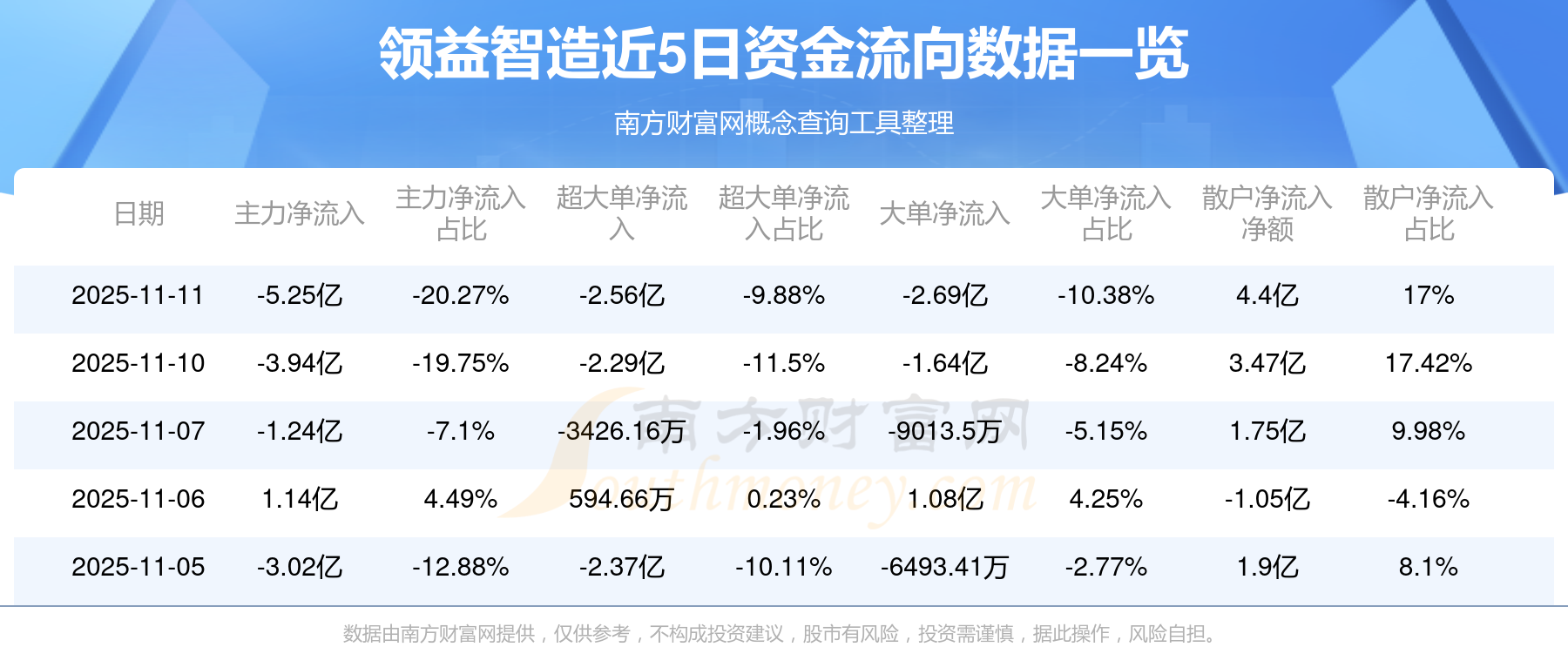 資金流向數(shù)據(jù)方面,11月11日主力資金凈流流出5.25億元,超大單資金凈流出2.56億元,大單資金凈流出2.69億元,散戶資金凈流入4.4億元。