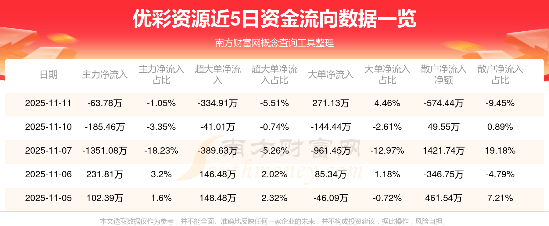 11月11日消息,優(yōu)彩資源資金凈流出63.78萬(wàn)元,超大單資金凈流出334.91萬(wàn)元,換手率2.25%,成交金額4906.76萬(wàn)元。