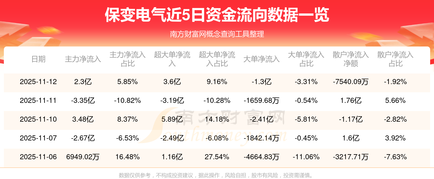 11月12日消息,保變電氣主力資金凈流入2.3億元,超大單資金凈流入3.6億元,散戶資金凈流出7540.09萬元。