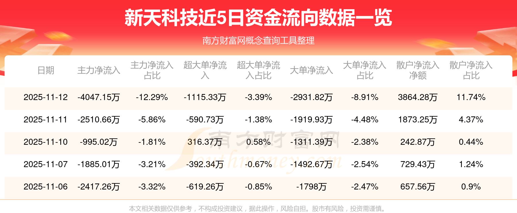 11月12日消息,新天科技資金凈流出4047.15萬元,超大單資金凈流出1115.33萬元,換手率5.87%,成交金額3.29億元。