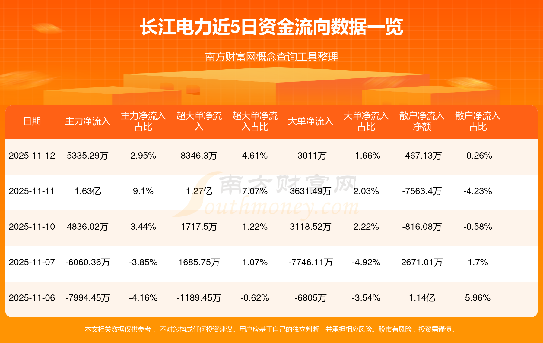 11月12日消息,長江電力主力凈流入5335.29萬元,超大單凈流入8346.3萬元,散戶凈流出467.13萬元。