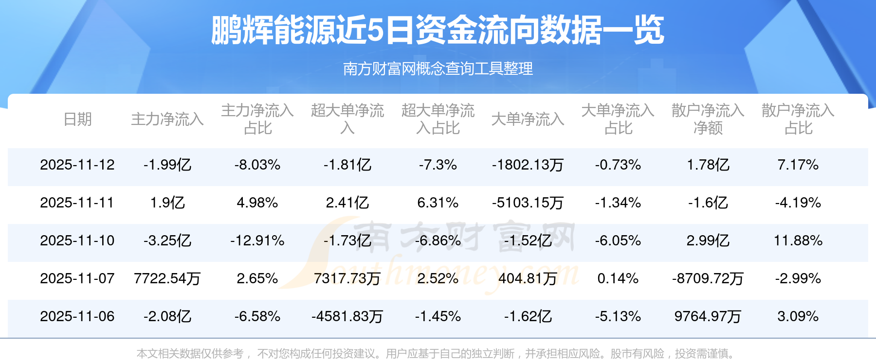 11月12日消息,鵬輝能源資金凈流出1.99億元,超大單資金凈流出1.81億元,換手率11.41%,成交金額24.76億元。