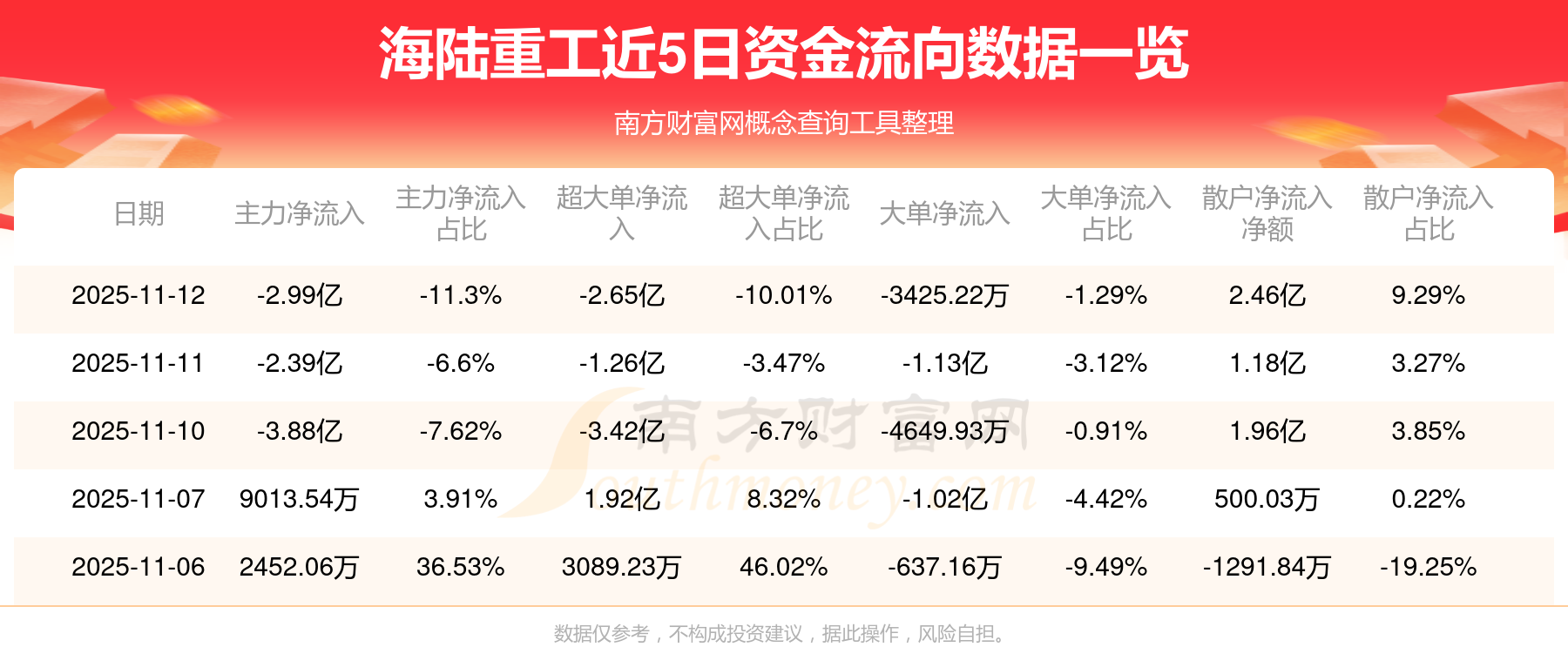 11月12日消息,海陸重工資金凈流出2.99億元,超大單凈流出2.65億元,換手率32.64%,成交金額26.48億元。