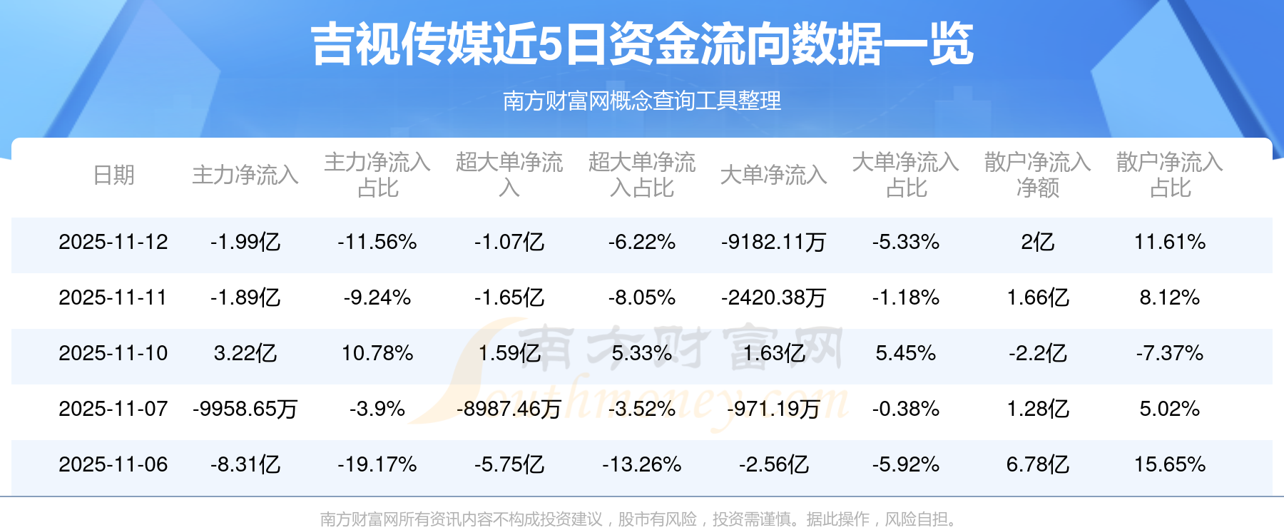11月12日消息,吉視傳媒主力資金凈流出1.99億元,超大單資金凈流出1.07億元,散戶資金凈流入2億元。