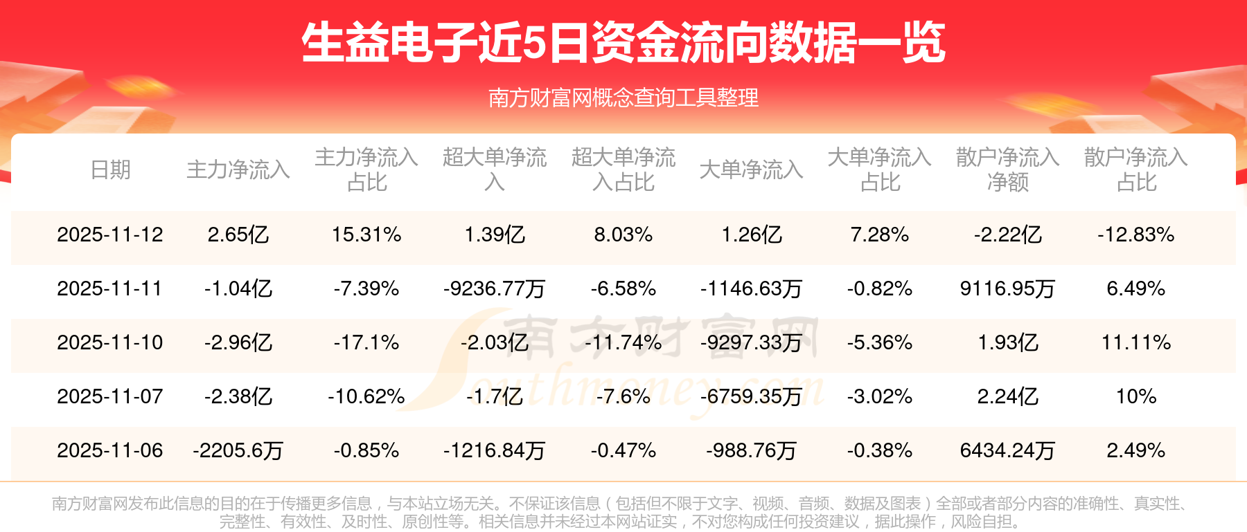 11月12日消息,生益電子11月12日主力凈流入2.65億元,超大單凈流入1.39億元,大單凈流入1.26億元,散戶凈流出2.22億元。