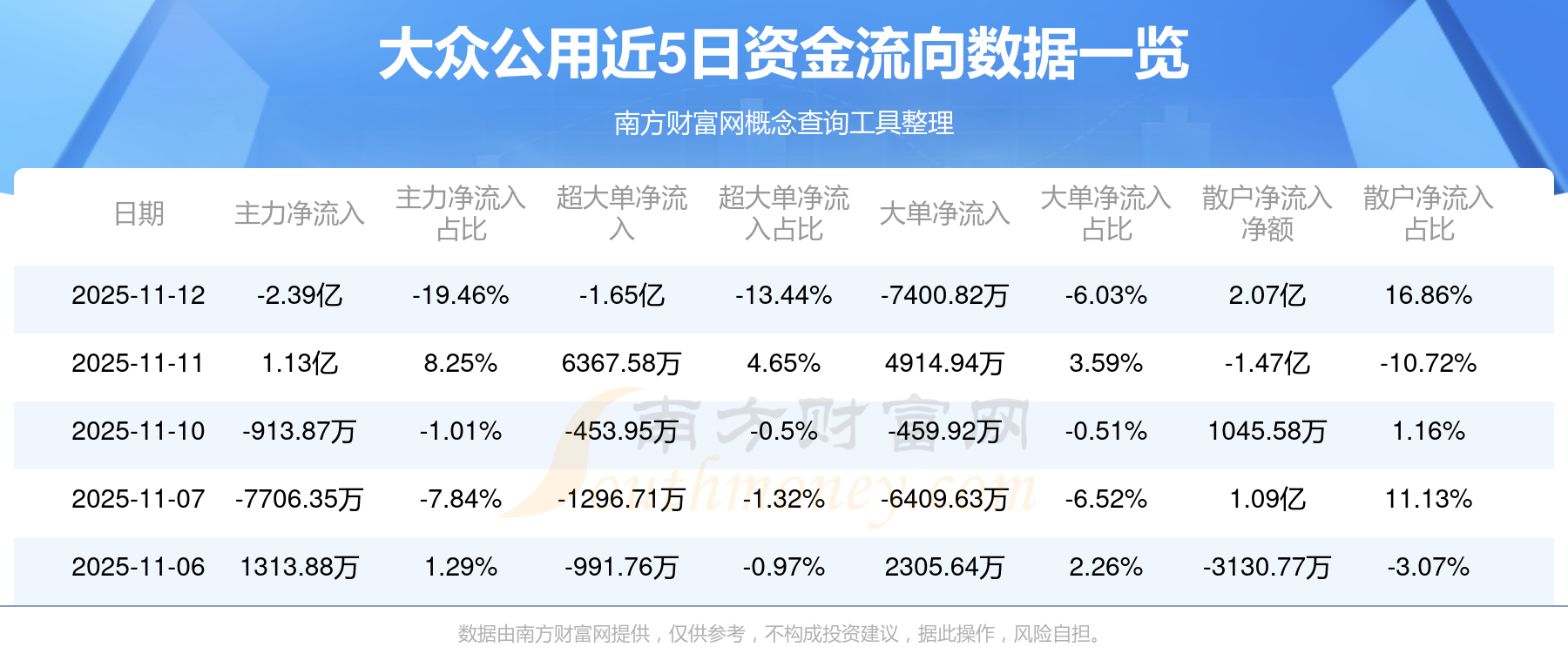 11月12日消息,大眾公用資金凈流出2.39億元,超大單資金凈流出1.65億元,換手率7.81%,成交金額12.28億元。