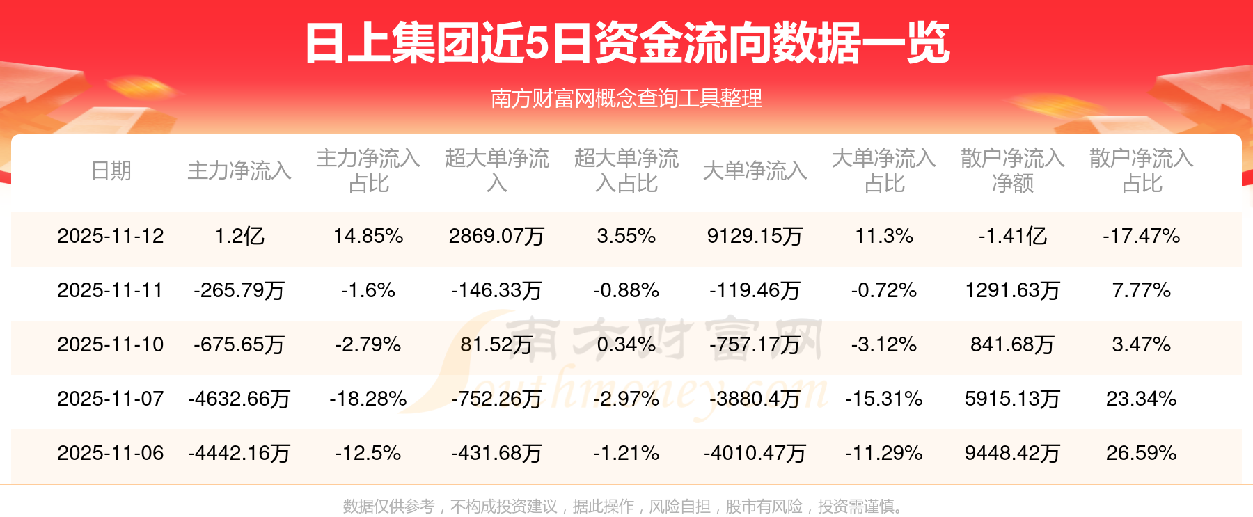 11月12日消息,日上集團(tuán)資金凈流入1.2億元,超大單凈流入2869.07萬(wàn)元,換手率23.99%,成交金額8.08億元。