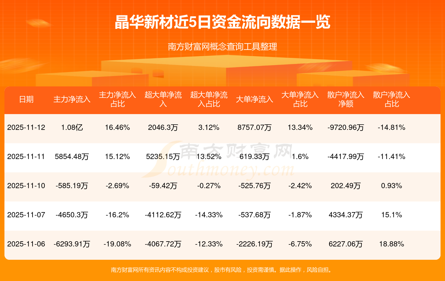 11月12日消息,晶華新材資金凈流入1.08億元,超大單凈流入2046.3萬元,換手率8.29%,成交金額6.57億元。