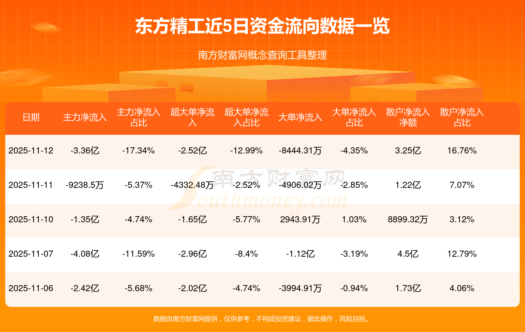 11月12日消息,東方精工11月12日主力資金凈流出3.36億元,超大單資金凈流出2.52億元,大單資金凈流出8444.31萬元,散戶資金凈流入3.25億元。
