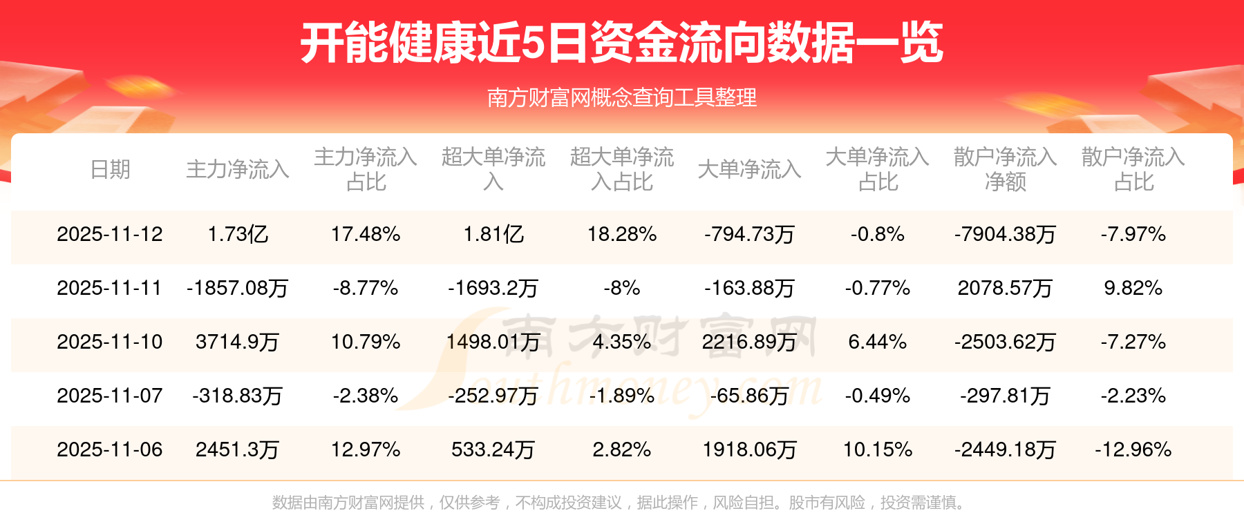 11月12日消息,開能健康11月12日主力資金凈流入1.73億元,超大單資金凈流入1.81億元,大單資金凈流出794.73萬元,散戶資金凈流出7904.38萬元。