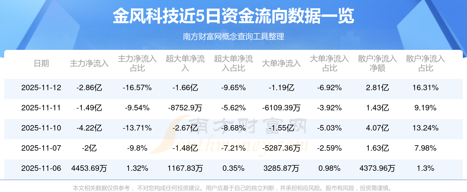 11月12日消息,金風科技資金凈流出2.86億元,超大單凈流出1.66億元,換手率3.43%,成交金額17.24億元。
