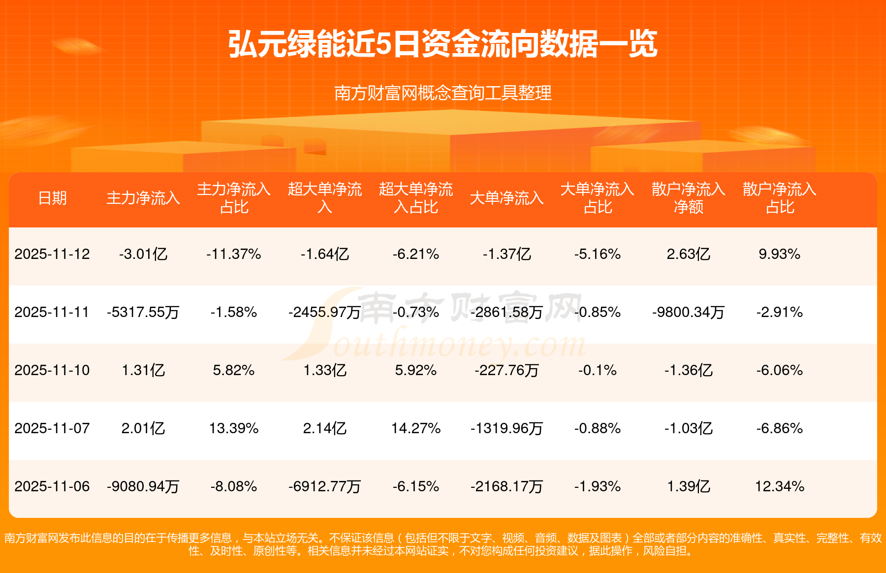 11月12日消息,弘元綠能11月12日主力凈流出3.01億元,超大單凈流出1.64億元,大單凈流出1.37億元,散戶凈流入2.63億元。