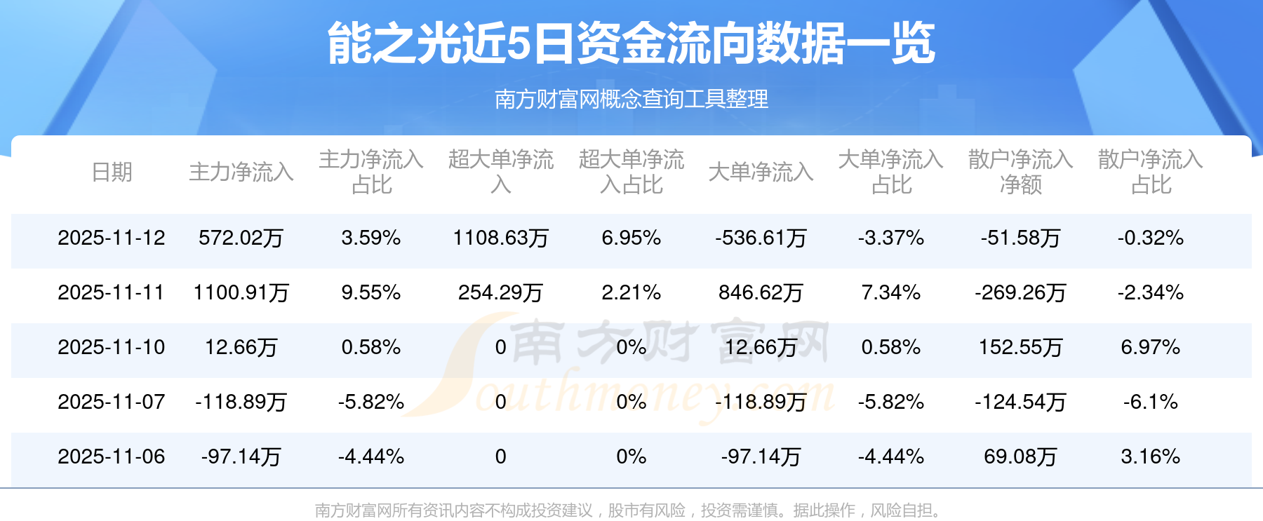 11月12日消息,能之光主力資金凈流入572.02萬(wàn)元,超大單資金凈流入1108.63萬(wàn)元,散戶資金凈流出51.58萬(wàn)元。