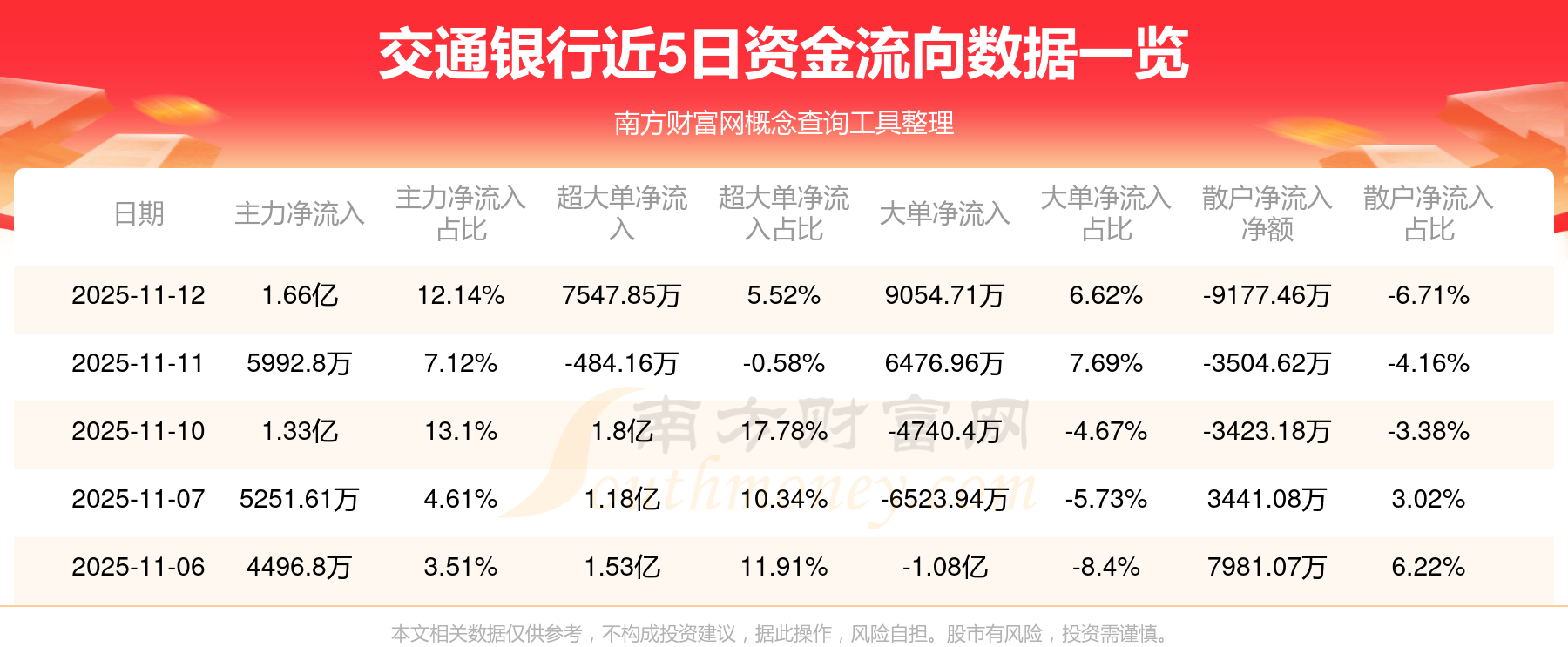11月12日消息,交通銀行資金凈流入1.66億元,超大單凈流入7547.85萬元,換手率0.7%,成交金額13.68億元。