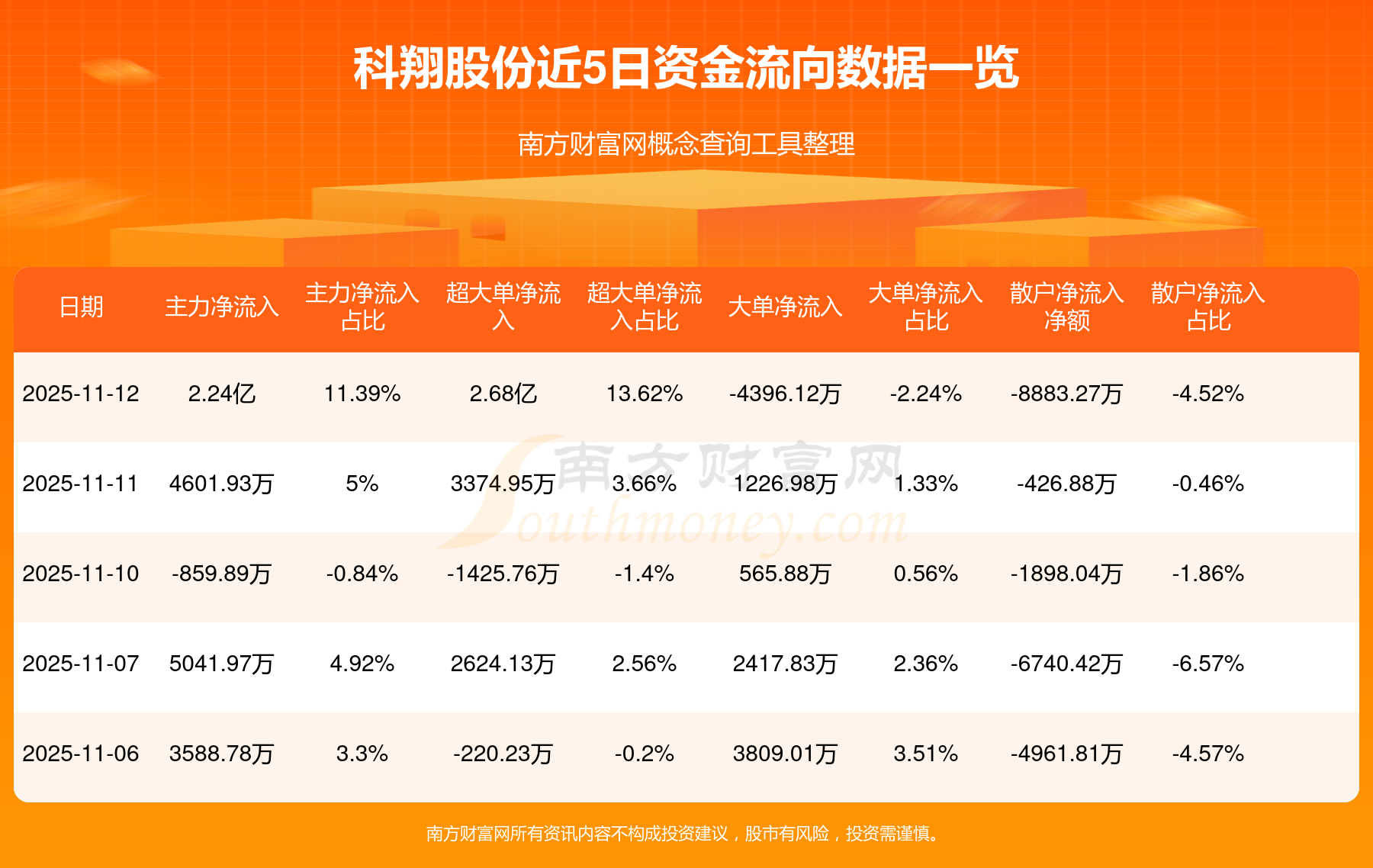 11月12日消息,科翔股份11月12日主力資金凈流入2.24億元,超大單資金凈流入2.68億元,大單資金凈流出4396.12萬元,散戶資金凈流出8883.27萬元。