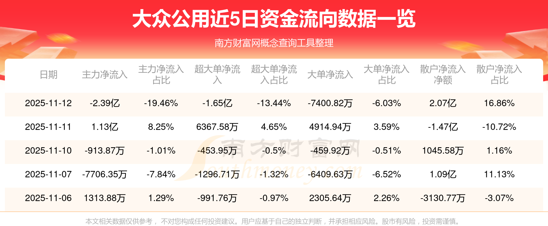11月12日消息,大眾公用資金凈流出2.39億元,超大單資金凈流出1.65億元,換手率7.81%,成交金額12.28億元。
