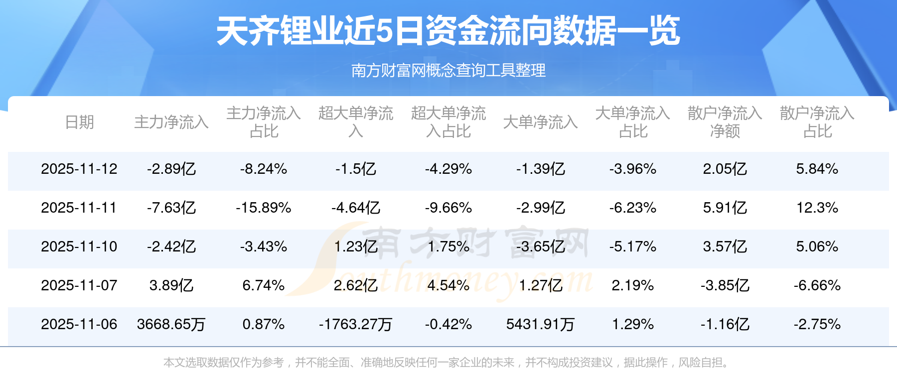 11月12日消息,天齊鋰業(yè)11月12日主力資金凈流出2.89億元,超大單資金凈流出1.5億元,大單資金凈流出1.39億元,散戶(hù)資金凈流入2.05億元。