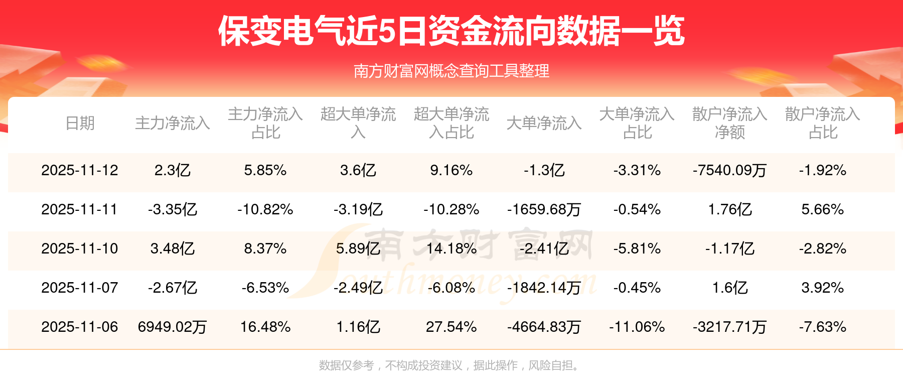 11月12日消息,保變電氣11月12日主力凈流入2.3億元,超大單凈流入3.6億元,大單凈流出1.3億元,散戶凈流出7540.09萬(wàn)元。