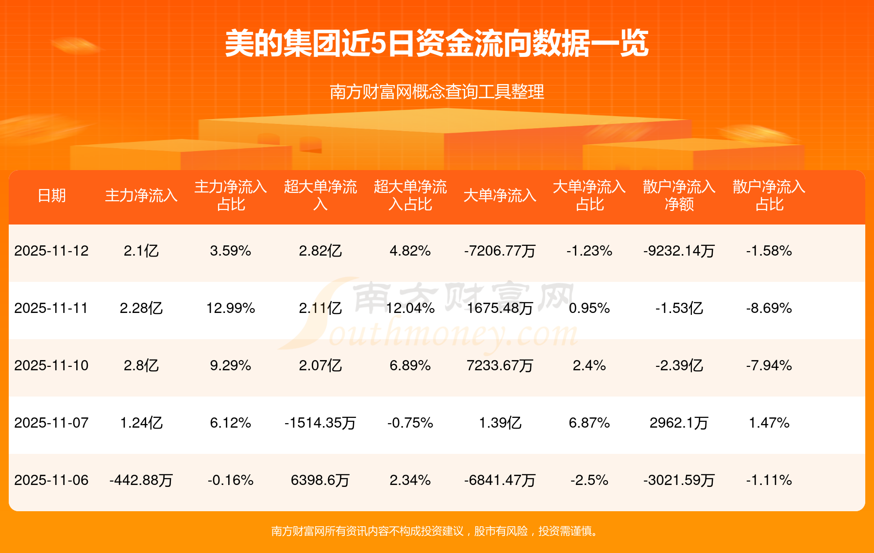 11月12日消息,美的集團11月12日主力資金凈流入2.1億元,超大單資金凈流入2.82億元,大單資金凈流出7206.77萬元,散戶資金凈流出9232.14萬元。