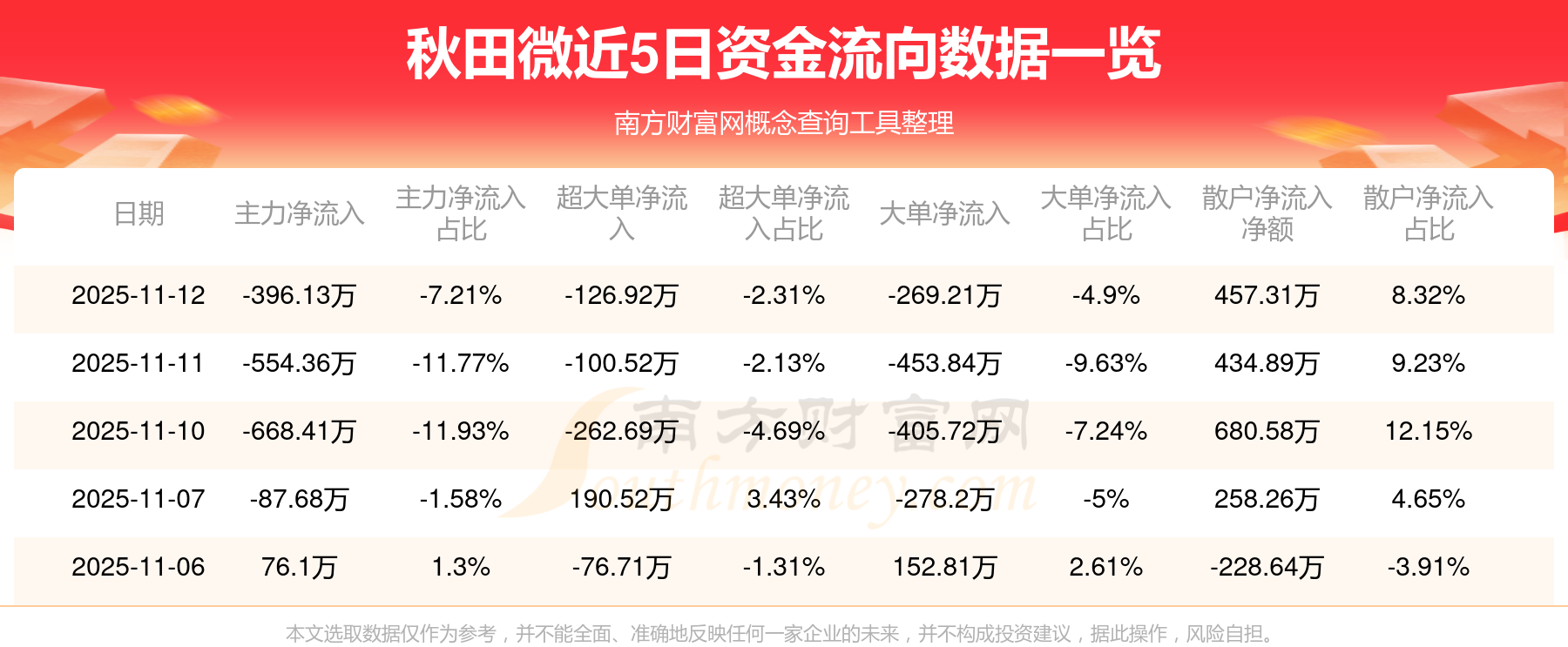 11月12日消息,秋田微資金凈流出396.13萬(wàn)元,超大單資金凈流出126.92萬(wàn)元,換手率1.43%,成交金額5496.17萬(wàn)元。