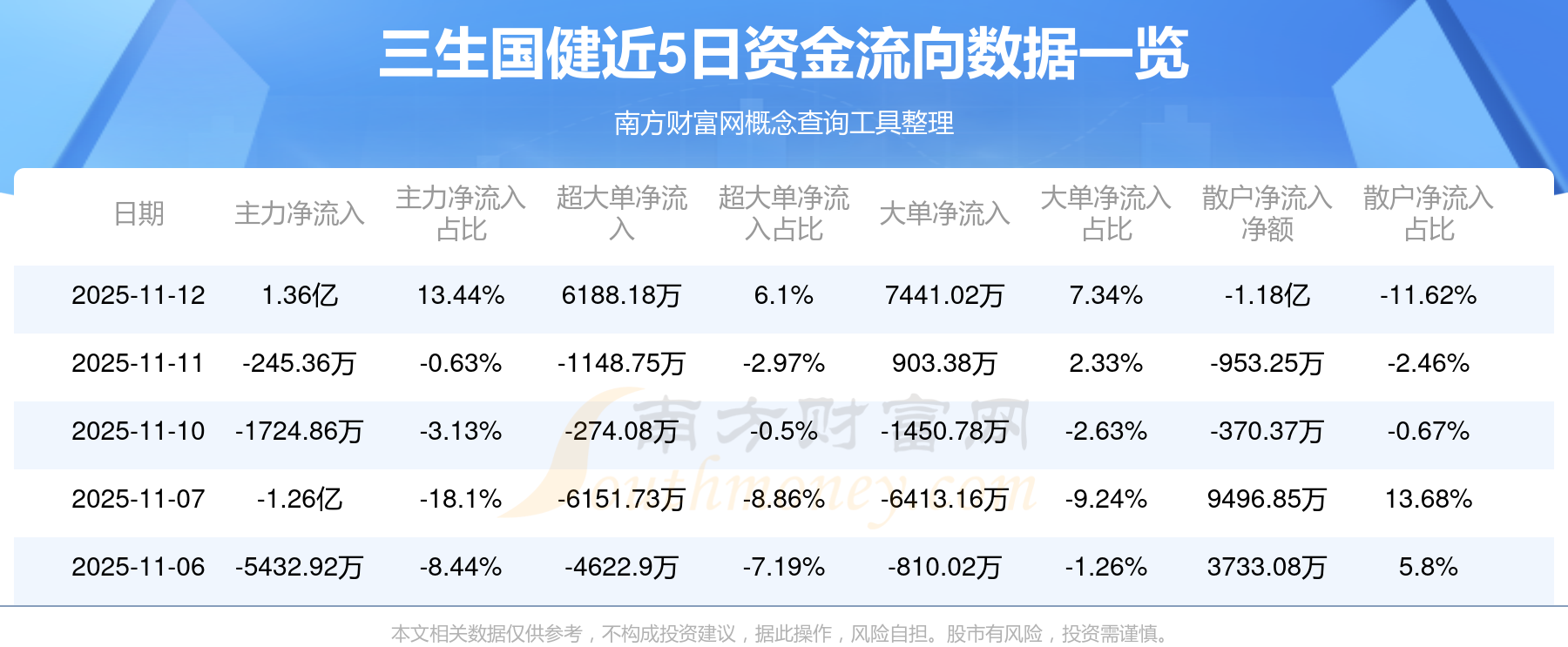 11月12日消息,三生國(guó)健資金凈流入1.36億元,超大單資金凈流入6188.18萬元,換手率2.41%,成交金額10.14億元。