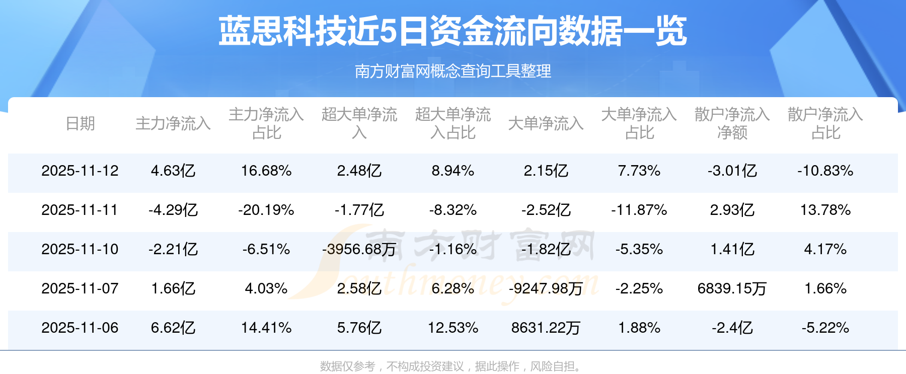 11月12日該股主力凈流入4.63億元,超大單凈流入2.48億元,大單凈流入2.15億元,中單凈流出1.62億元,散戶凈流出3.01億元。