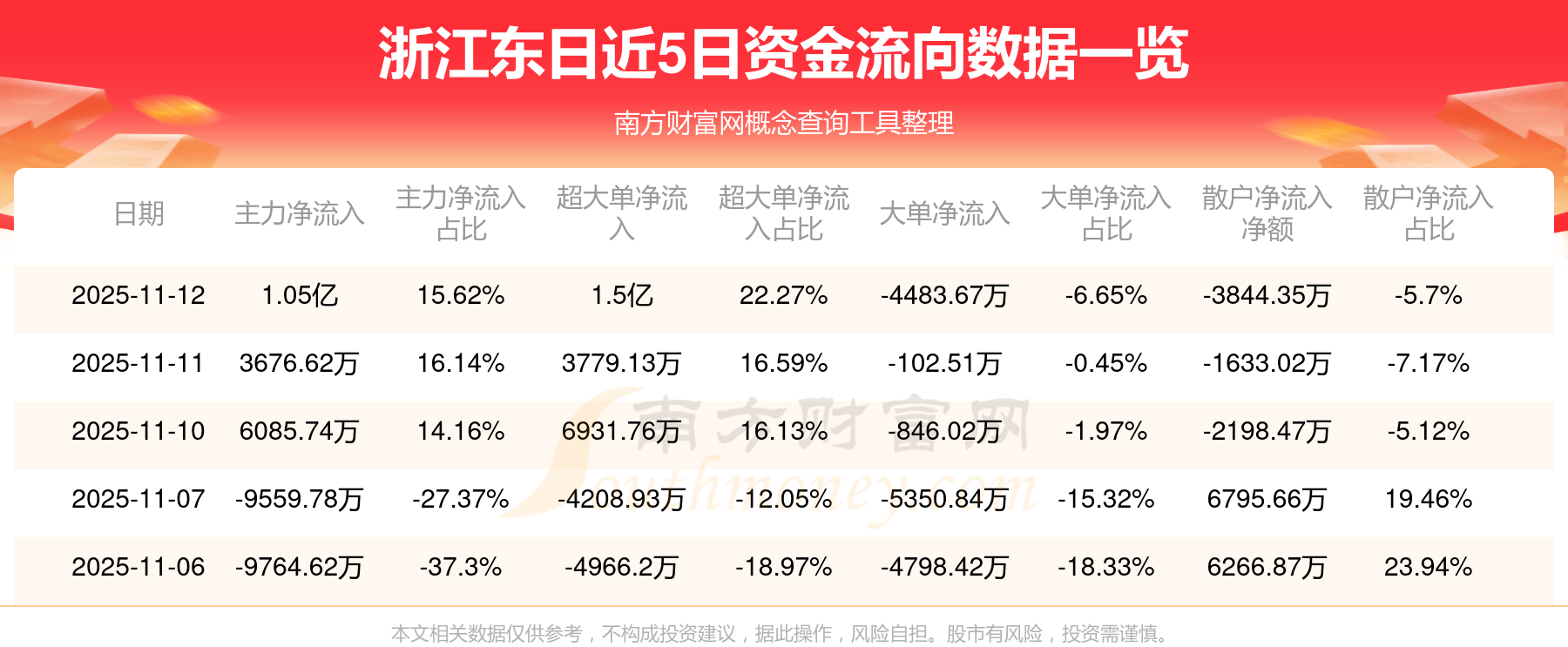 11月12日消息,浙江東日主力凈流入1.05億元,超大單凈流入1.5億元,散戶凈流出3844.35萬元。