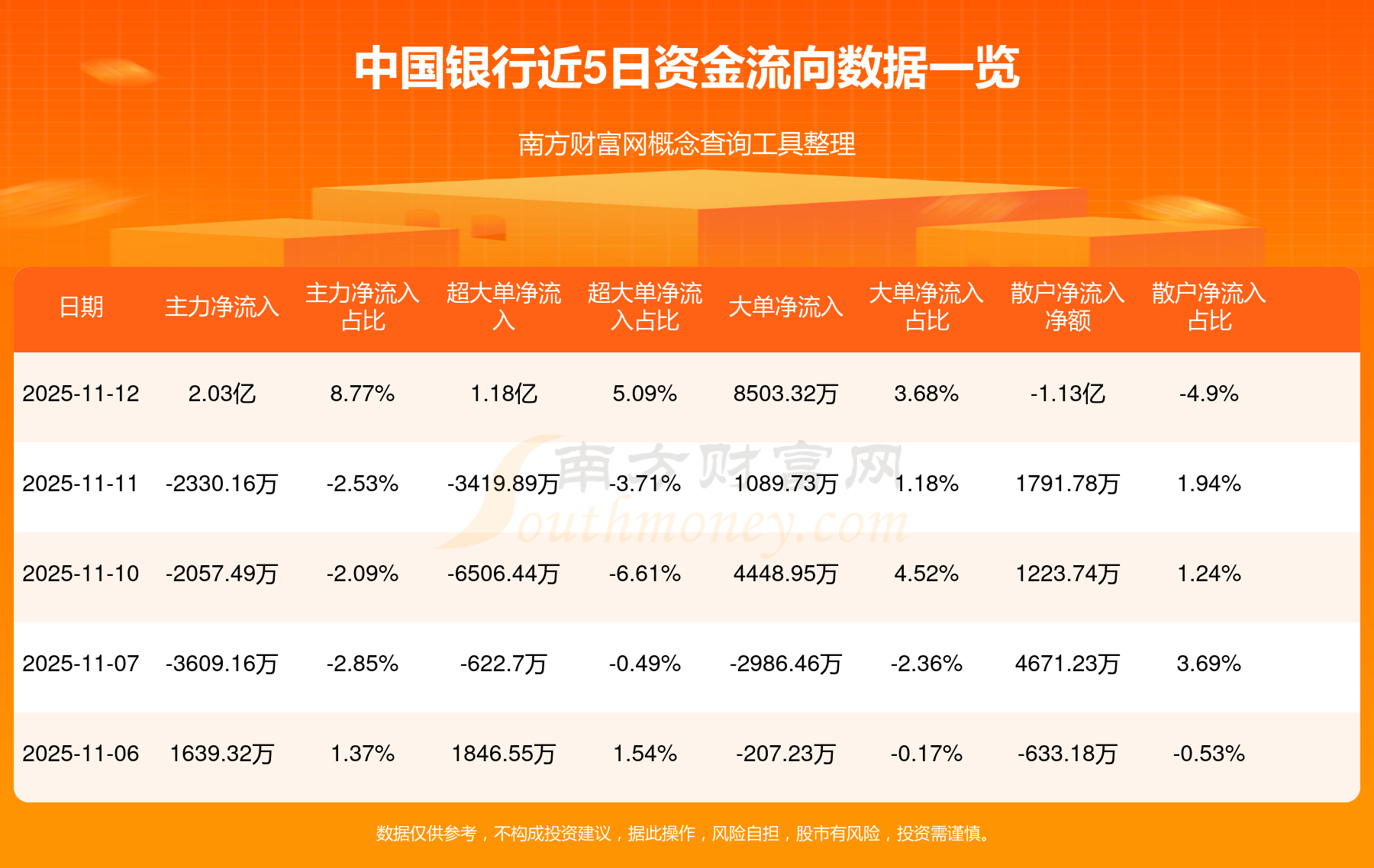 11月12日消息,中國銀行11月12日主力凈流入2.03億元,超大單凈流入1.18億元,大單凈流入8503.32萬元,散戶凈流出1.13億元。