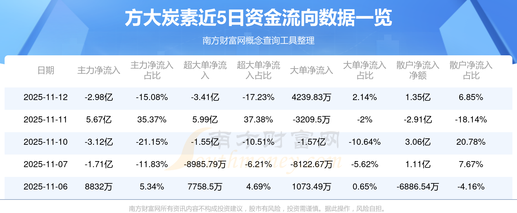 資金流向數(shù)據(jù)方面,11月12日主力資金凈流流出2.98億元,超大單資金凈流出3.41億元,大單資金凈流入4239.83萬元,散戶資金凈流入1.35億元。