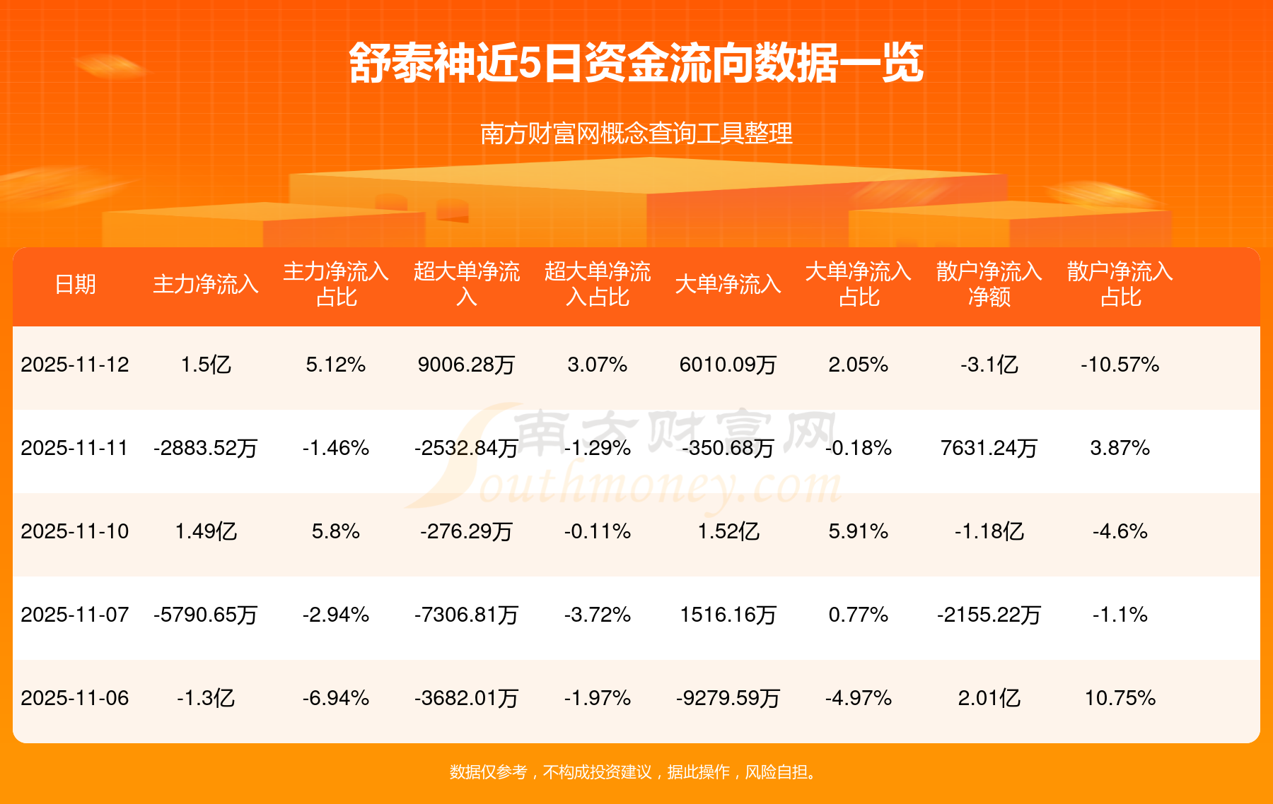 11月12日消息,舒泰神主力凈流入1.5億元,超大單凈流入9006.28萬元,散戶凈流出3.1億元。