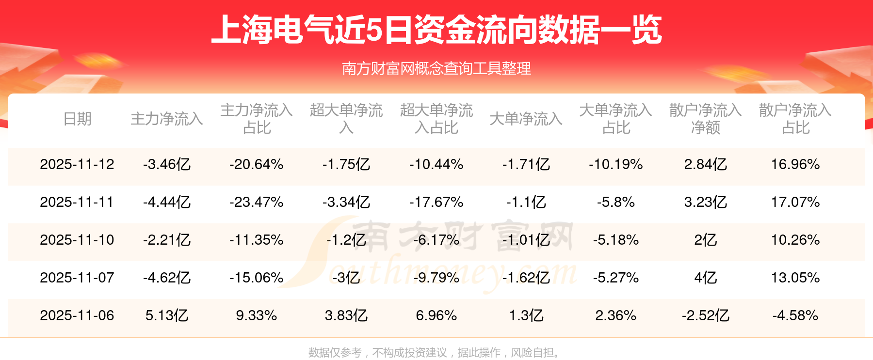 11月12日消息,上海電氣11月12日主力凈流出3.46億元,超大單凈流出1.75億元,大單凈流出1.71億元,散戶凈流入2.84億元。