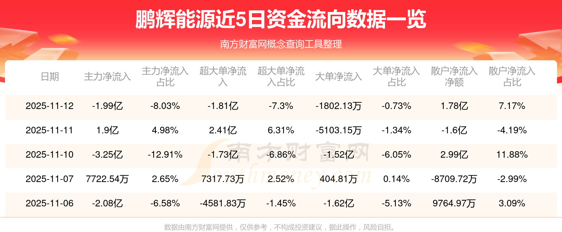 11月12日消息,鵬輝能源資金凈流出-1.99億元,超大單資金凈流入-1.81億元,最新報54.000元,換手率11.41%,成交總金額24.76億元。