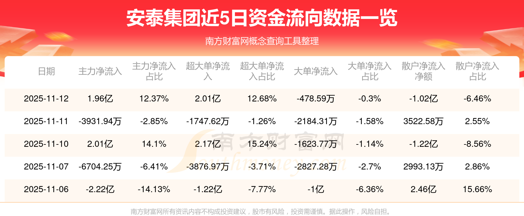 11月12日消息,安泰集團(tuán)11月12日主力資金凈流入1.96億元,超大單資金凈流入2.01億元,大單資金凈流出478.59萬元,散戶資金凈流出1.02億元。
