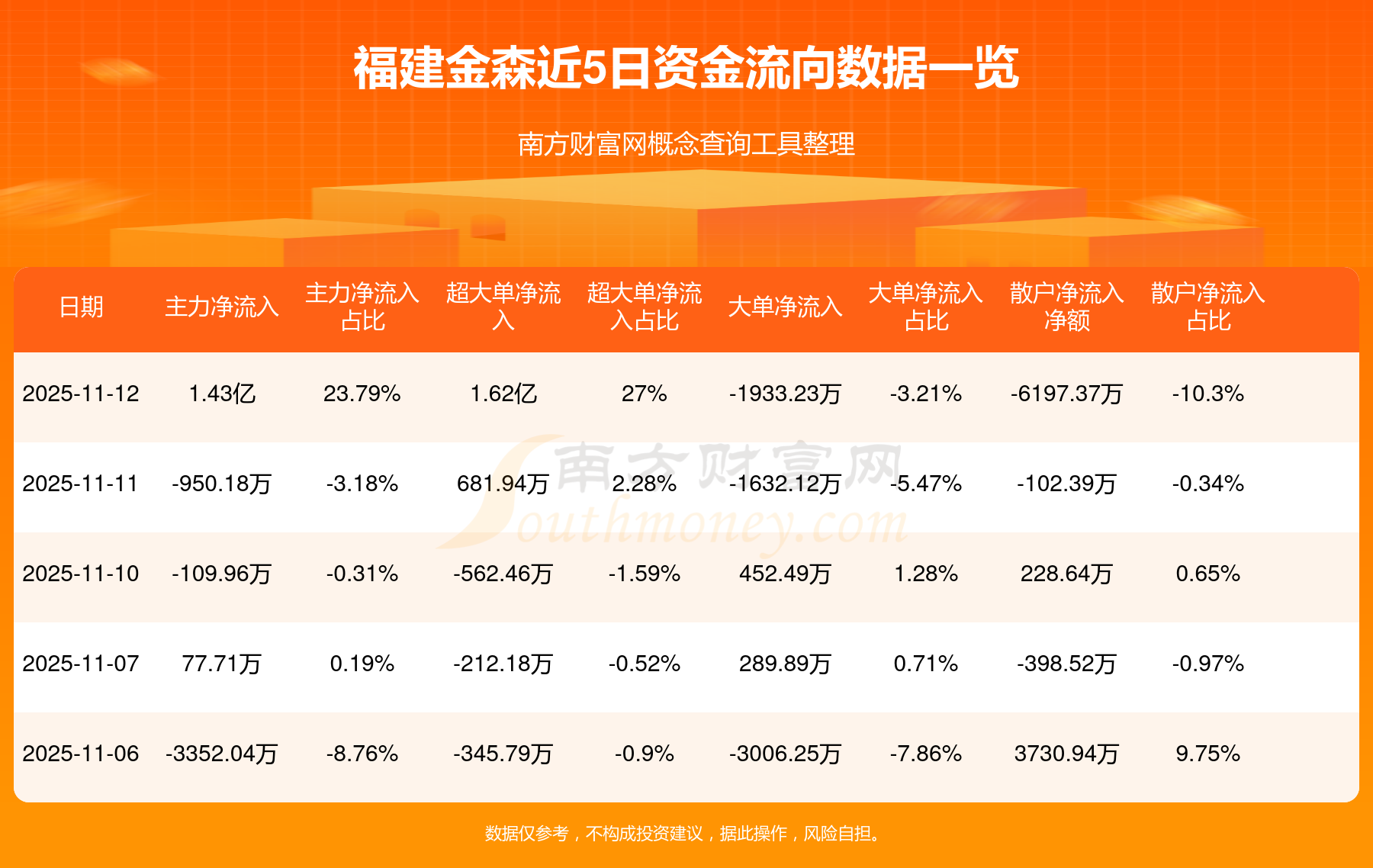 資金流向數(shù)據(jù)方面,11月12日主力資金凈流流入1.43億元,超大單資金凈流入1.62億元,大單資金凈流出1933.23萬元,散戶資金凈流出6197.37萬元。