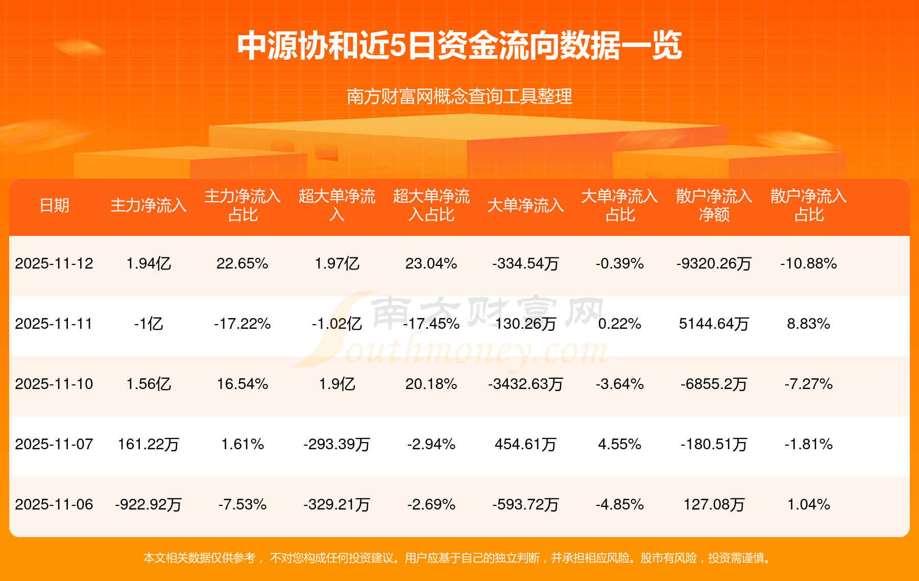 11月12日消息,中源協(xié)和主力資金凈流入1.94億元,超大單資金凈流入1.97億元,散戶資金凈流出9320.26萬(wàn)元。
