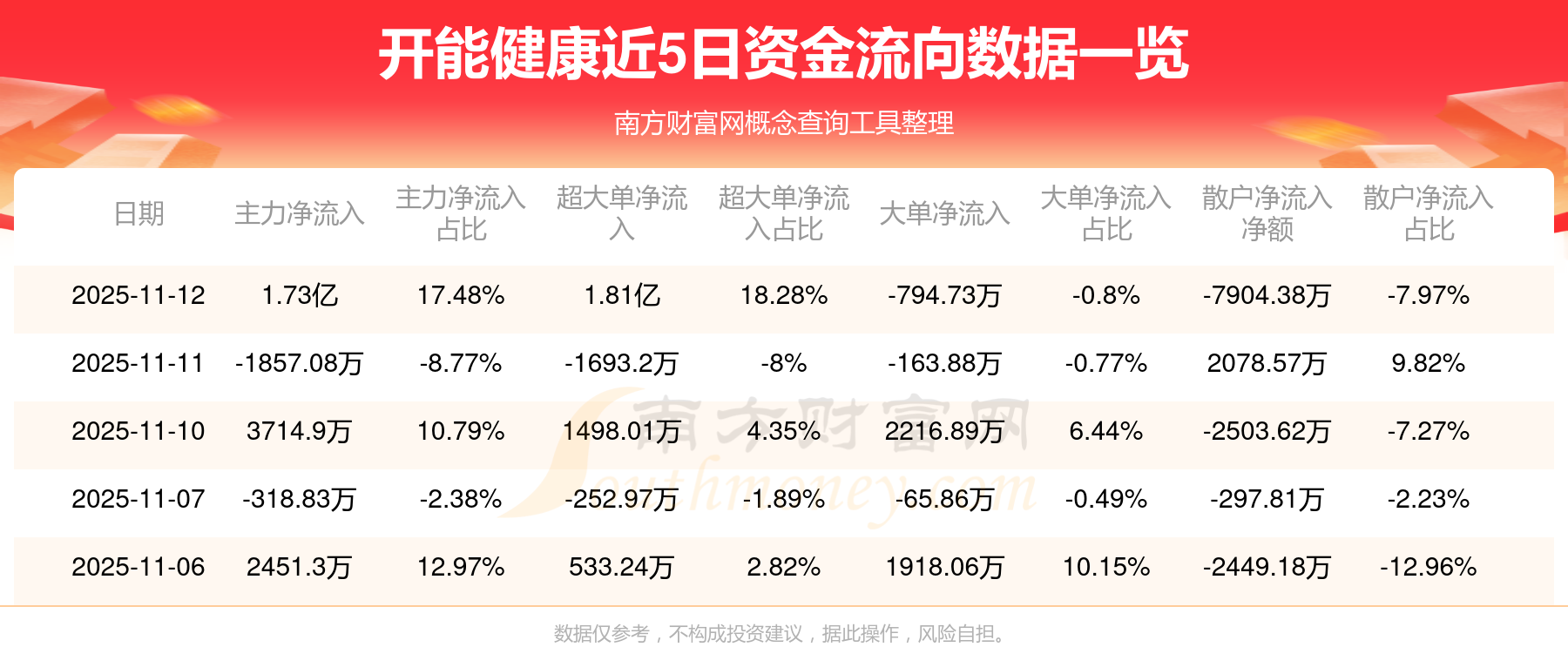 11月12日消息,開能健康資金凈流入1.73億元,超大單資金凈流入1.81億元,換手率26.68%,成交金額9.92億元。