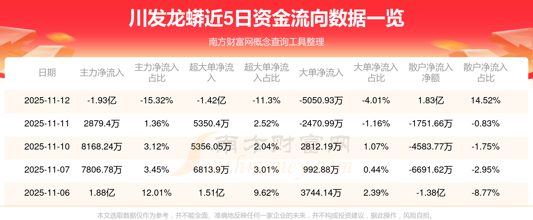 11月12日消息,川發(fā)龍蟒資金凈流出1.93億元,超大單資金凈流出1.42億元,換手率5.31%,成交金額12.58億元。