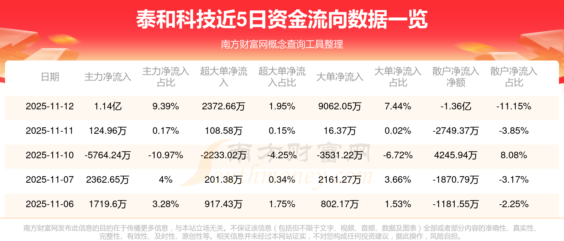 11月12日消息,泰和科技主力凈流入1.14億元,超大單凈流入2372.66萬元,散戶凈流出1.36億元。