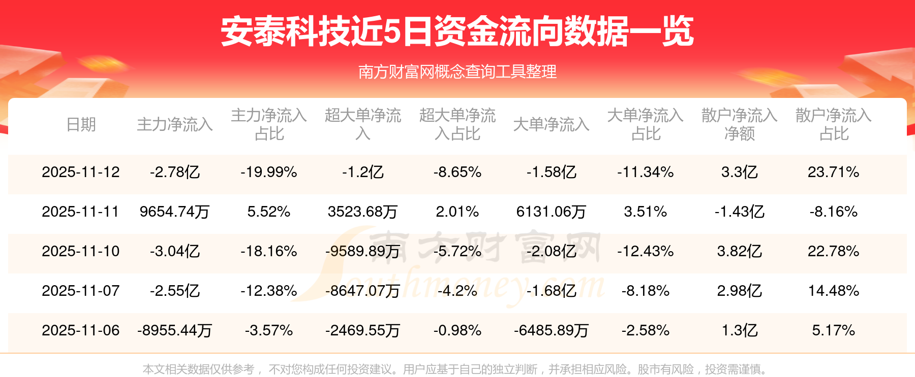 11月12日消息,安泰科技資金凈流出2.78億元,超大單資金凈流出1.2億元,換手率6.97%,成交金額13.92億元。