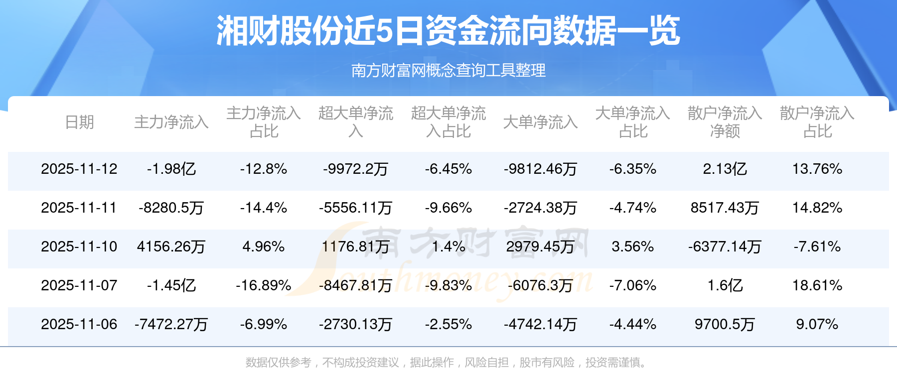 11月12日消息,湘財(cái)股份11月12日主力凈流出1.98億元,超大單凈流出9972.2萬(wàn)元,大單凈流出9812.46萬(wàn)元,散戶凈流入2.13億元。