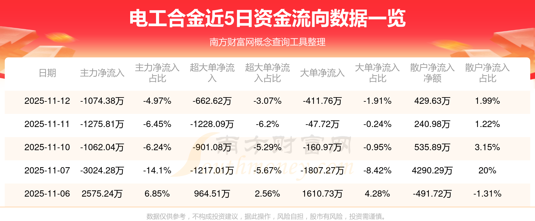 11月12日消息,電工合金資金凈流出1074.38萬元,超大單資金凈流出662.62萬元,換手率3.91%,成交金額2.16億元。